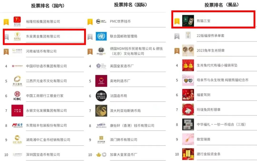 經過7天的激烈角逐,東吳黃金憑借著專業(yè)的行業(yè)實力和人氣超高的爆款展品,再次斬獲全國“十佳國內展商”榮譽;東吳黃金參展的人氣展品“熊貓三寶”也在眾多展品中脫穎而出,榮登“十佳展品”榜首。東吳黃金再度以佳績印證實力!